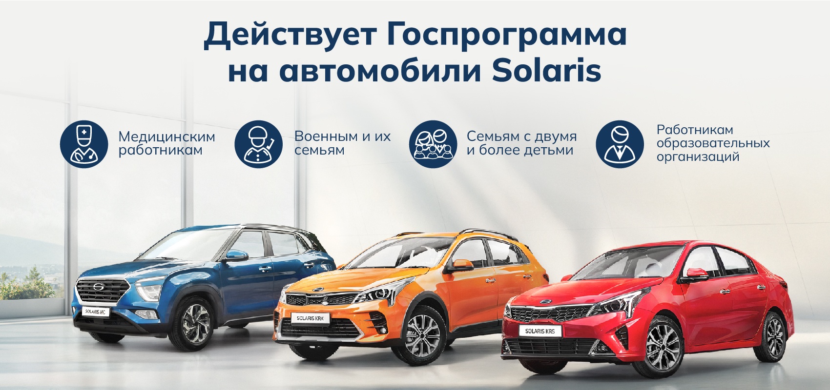 *Выгода в рамках Государственной программы автокредитования (Пост. Правительства РФ No 1834 от 01 ноября 2023 года (с изменениями и дополнениями)) может предоставляться следующим категориям граждан Российской Федерации: • скидка 10% по программе «Семейный автомобиль» — семьям с двумя и более несовершеннолетних детей; • скидка 20% для ДФО - семьям с одним и более несовершеннолетних детей; • скидка в размере 20% (25% для ДФО)-работникам медицинских организаций государственной системы здравоохранения; работникам государственных и муниципальных образовательных организаций; гражданам, проходящим военную службу по контракту или военную службу по призыву в соответствии с Федеральным законом «О воинской обязанности и военной службе», либо являющимся супругой (супругом), детьми или родителями, проживающими совместно с гражданами, проходящими военную службу по контракту или военную службу по призыву в соответствии с Федеральным законом «О воинской обязанности и военной службе»; гражданам РФ с инвалидностью. Прочие условия госпрограммы зафиксированы в актуальной версии Постановления No1834 от 01 ноября 2023 года. Предложение ограничено лимитами субсидии от Минпромторга РФ. Не является офертой и распространяется на автомобили Solaris KRS, Solaris KRX и Solaris HC, паспорт транспортного средства на которые выпущен не ранее 1 декабря 2024 года, при этом в отношении моделей Solaris KRX и Solaris KRS действуют дополнительные ограничения. Подробности уточняйте у официальных дилеров Solaris, перечень которых приведен на сайте https://solaris.auto/#dealers. Выгоды по программам не суммируются. Финансовые услуги предоставляются ПАО «Совкомбанк», лицензия Банка России No963, информация об условиях гос. программы автокредитования размещена на сайте https://sovcombank.ru/apply/auto/lgotnyj-avtokredit; ПАО «ВТБ», лицензия Банка России No1000, информация об условиях гос. программы автокредитования размещена на сайте https://www.vtb.ru/personal/avtokredity/gosprogramma-subsidirovaniya-avtokreditov-2022 ДФО - Дальневосточный федеральный округ Российской Федерации